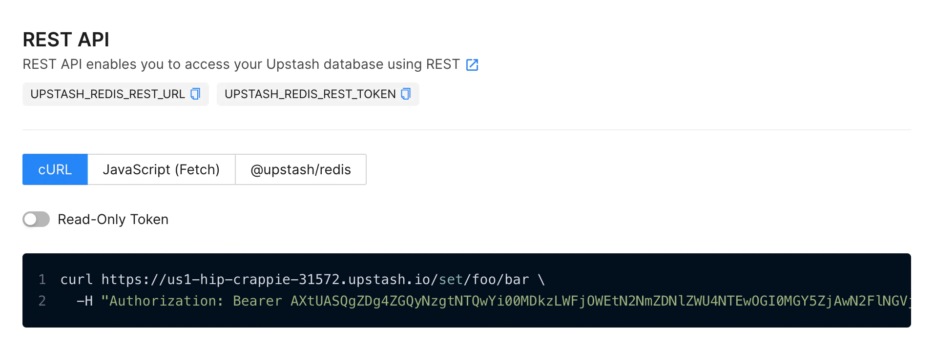 UPSTASH_REDIS_REST_TOKEN in REST API section of the console. For the Read