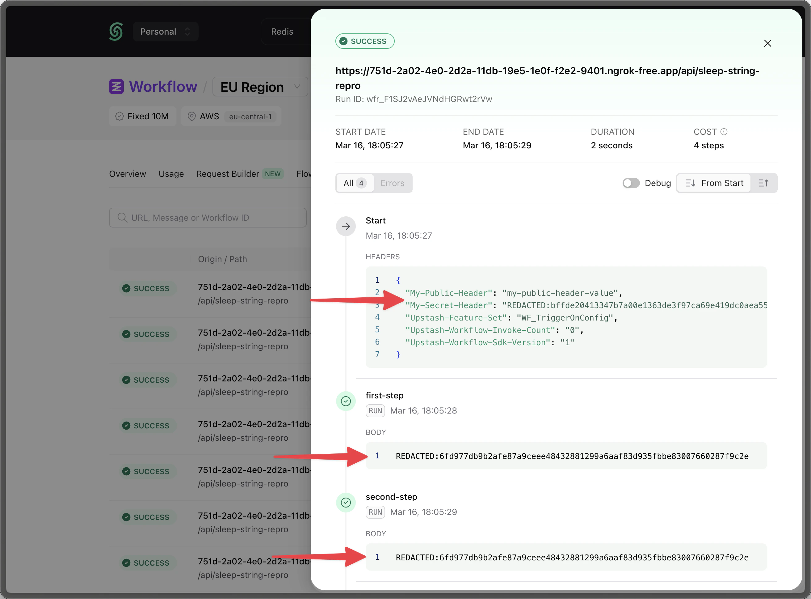 REDACTED:<SHA256> in the dashboard and API. The original values are still used when delivering requests to your workflow endpoint. The SHA256 hash lets you verify the data without revealing the original values.